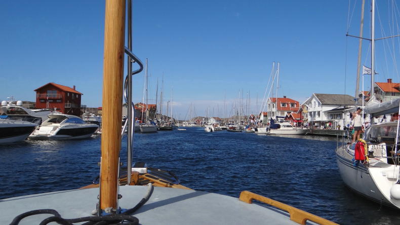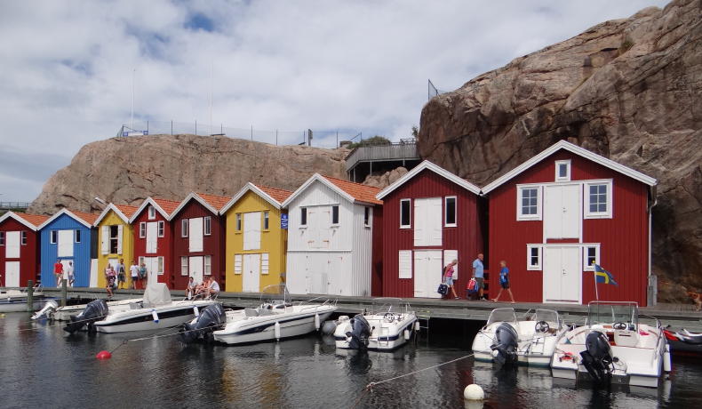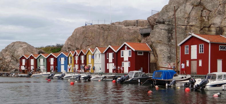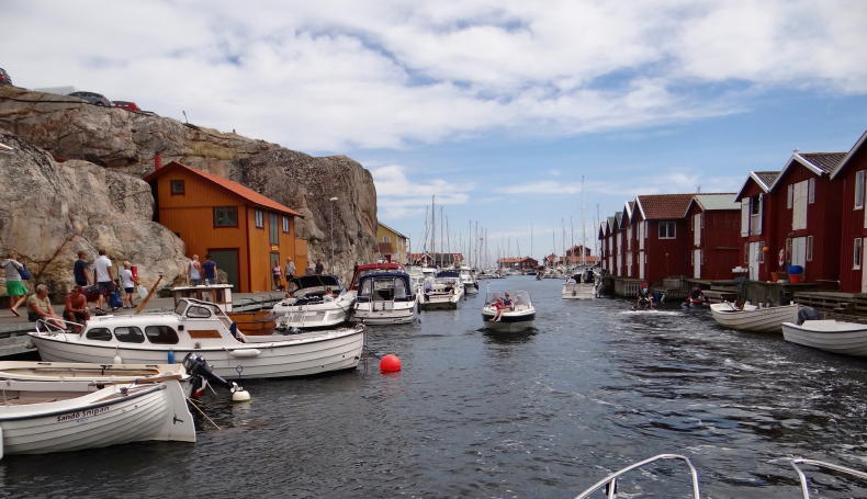 Mit dem Motorboot empfanden wir das langsame Gleiten in den Hafen von Smögen als ein tolles Erlebnis. Wir sind immer am Holzsteg entlang bis ganz zum Ende gefahren. Hier findet man eine kleine Bucht mit einem der beliebtesten schwedischen Postkartenmotive: Am Ängebacken liegen bunt bemalte Fischerhütten und Bootshäuser. Auch vom Wasser aus erkennt man, wie eng es im Gästehafen zugeht. Insgesamt gibt es auf der kurzen Strecke 200 Liegeplätze für Segel- und Motorboote.