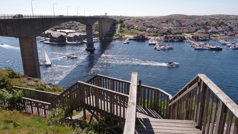 Smögen ist über eine hohe und 500 Meter lange Brücke, die Smögenbron, mit dem Festland verbunden. Auf der Festlandseite gibt es kurz vor der Brücke Rast- und Parkplätze für einen kurzen Stopp, so dass man anhalten und die beeindruckende Aussicht fotografieren kann. Der Besuch in Smögen mit dem Auto ist nicht billig. Das Parken in der Nähe der Smögenbryggan kostet tagsüber SEK 42/Stunde (Stand 2023, Smögenbryggans Parkering – keine Wohnmobile KW 28 – 32 und an Mittsommer).
