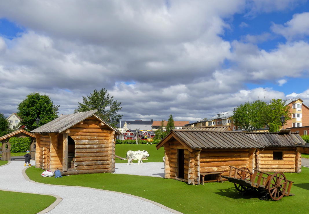 Im Zentrum findet Ihr Cafés (u. a. Fresans Konditori, Lisagatan 30, Bäckerei und leichterer Lunch – z. B. gegrilltes Baguette mit Salat), einen Kinderspielplatz (der sieht aus wie ein rustikales Dalarna-Freilichtmuseum in Klein), einen Lidl und Malungs Camping (direkt am Västerdalälven und an einem kleinen See, der mit dem Fluss verbunden ist – siehe Bild oben auf dieser Seite).