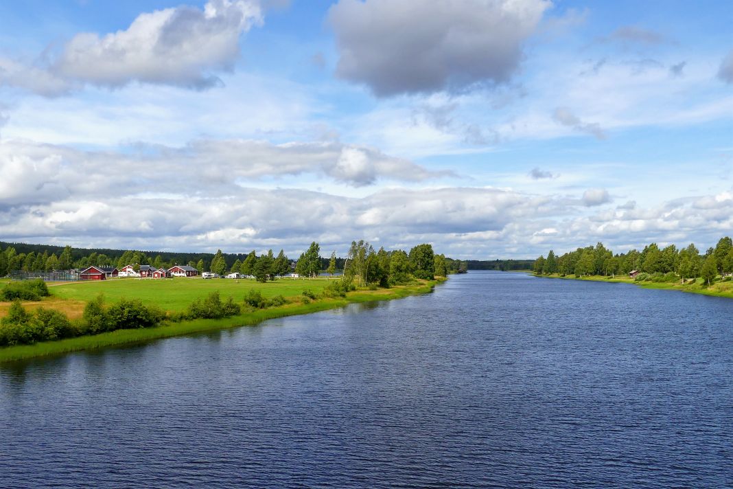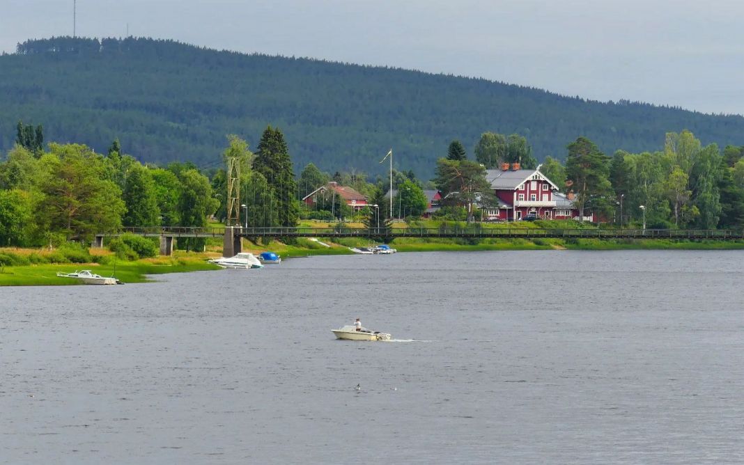Bild ganz oben auf der Seite: Der Västerdalälven, fotografiert von der E45-Brücke im Ortstzentrum.