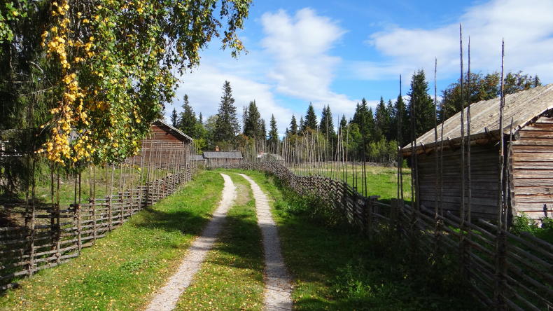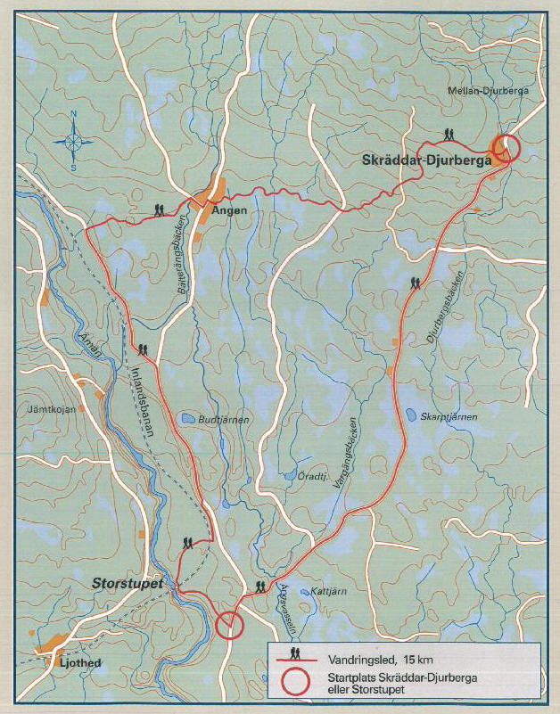 Mal Pfad, mal Schotterweg. Teilweise feucht und steinig. Die Wanderung beginnt an einer im Sommer bewirtschafteten Almhütte („fäbod“), die Skräddar-Djurberga heißt. Hier kann man einen Kaffe bekommen und Butter und Käse kaufen. Ziel der Wanderung ist der Canyon „Storstupet“: Hier wurden früher Holzstämme an den Stromschnellen vorbei durch eine Rinne („forsränna“) geflößt – im Frühjahr sollen sich hier die Stämme manchmal so verkeilt haben, dass man den Wasserweg freisprengen musste. Der Storstupet ist von zwei Seiten aus erreichbar. Über den Storstupet führt eine Eisenbahnbrücke der Inlandsbanan (34 Meter über den Stromschnellen). Die Inlandsbanan hält hier wohl auf der Brücke manchmal an, damit die Fahrgäste fotografieren können. – Mittagessen kann man in einem urigen Wirtshaus in der Nähe, das ein Schleifstein-Museum beherbergt: „Värdshuset Slipstenen“.