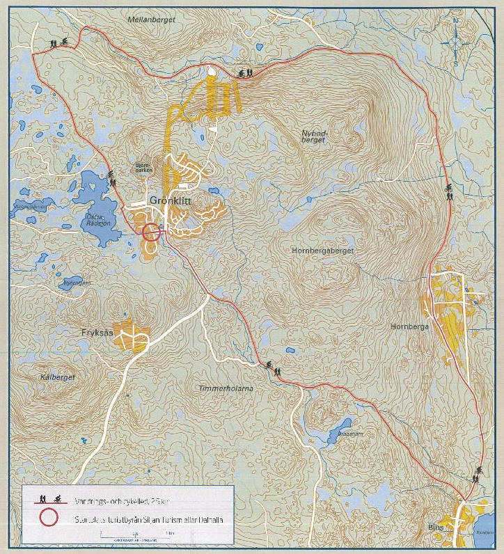 Diese Strecke ist ein kombinierter Wander- und Fahrradweg (mit dem Rad braucht man für die Strecke 1 – 3 Stunden). Mit Steigungen, aber zumeist auf Schotterwegen. Ein Pfad mit „Wildmarksgefühl“. Aussicht über die Wälder von Orsa. In Grönklitt kann man auch Europas größten Bärenpark besuchen. Ein Abstecher zum 500 m hoch gelegenen Fryksås Fäbod (Almhütte) ist möglich. Fahrradverleih gibt es im Sport-Shop von Grönklitt.