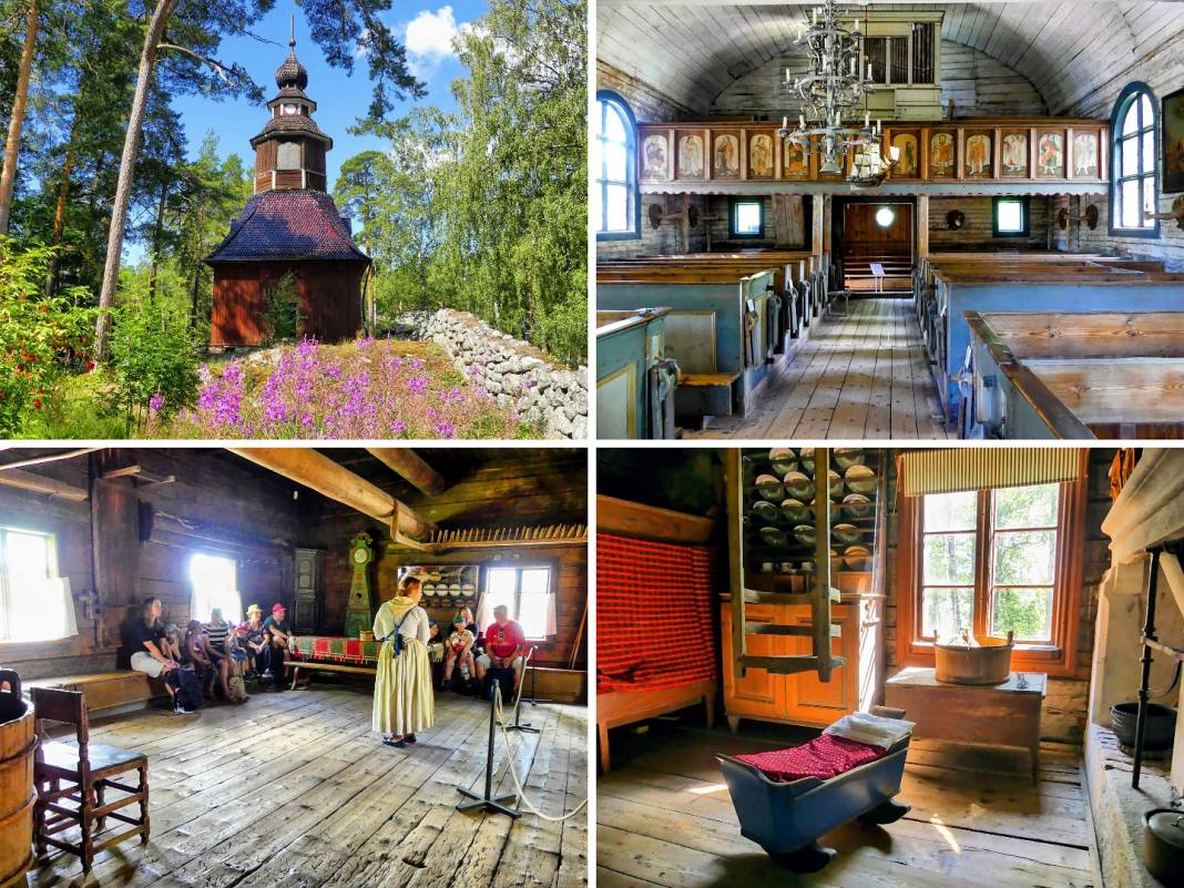 Bilder in der oberen Reihe: Karuna Kirche aus Sagu. Die Kirche ist das älteste Gebäude des Museums. Sie stammt von 1685. – Bilder in der unteren Reihe: Der Hof Halla gehörte einem Landtagsabgeordneten, der Hof und Landwirtschaft modernisierte.