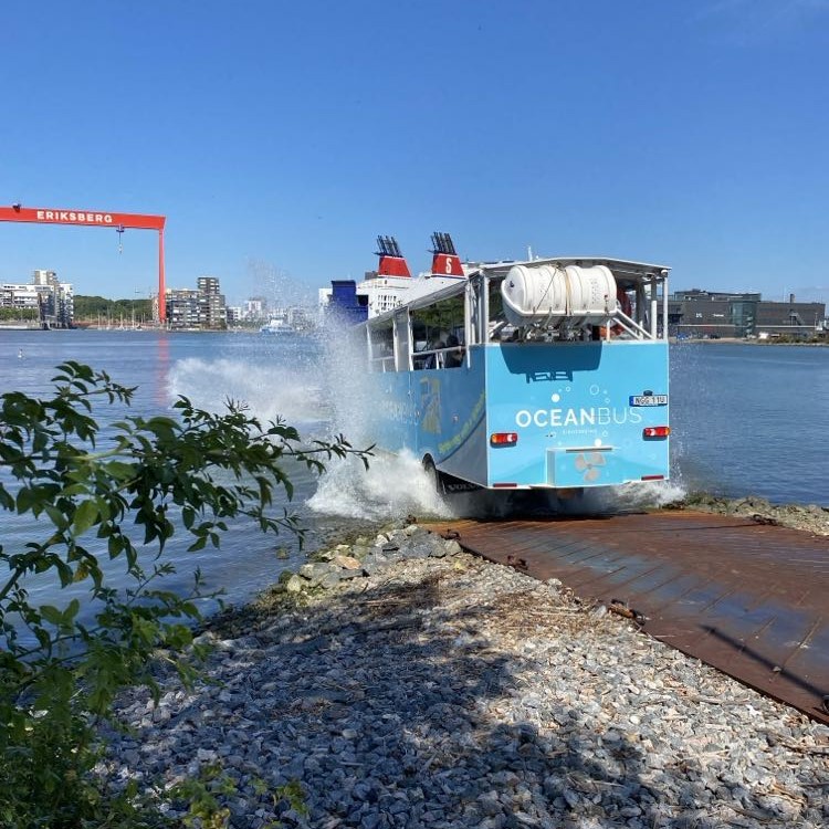 Es ist ein aufregendes, ja atemberaubendes Gefühl, wenn der zehn Tonnen schwere Amphibienbus mit einem Platschen im Wasser landet. Er sieht aus wie ein normaler Bus und verhält sich auf der Hälfte der Strecke auch genauso. Doch dann passiert es – der Bus stürzt sich vom Ufer ins Wasser. Der Ort des Geschehens: die Hafeneinfahrt im Zentrum Göteborgs. Danach geht es eine Runde durch den Hafen, bevor es Zeit ist, wieder an Land zurückzukehren.