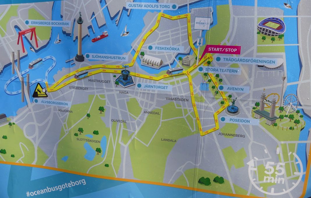 Der Bus fährt an vielen berühmten Plätzen vorbei wie z. B. Chalmers (Technische Hochschule), Järntorget, Kungsparken, Feskekörka, Olof Palmes Haus und den Werftkränen. Auch Statuen wie die Seemannsfrau und Poseidon sind zu sehen.