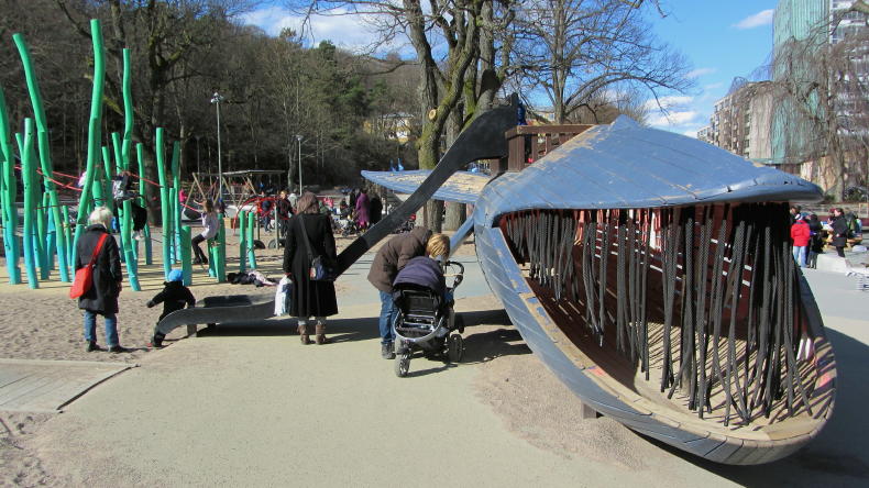 Dort gibt es nicht nur spannende Spielgeräte zum Klettern, Schaukeln und Rutschen, sondern auch Leihspielzeug, tägliches Programm und Grillmöglichkeiten. Besonders populär ist ein 15 m langer Wal, auf dem man klettern kann. Er ist dem Wal im Naturhistorischen Museum nachempfunden.