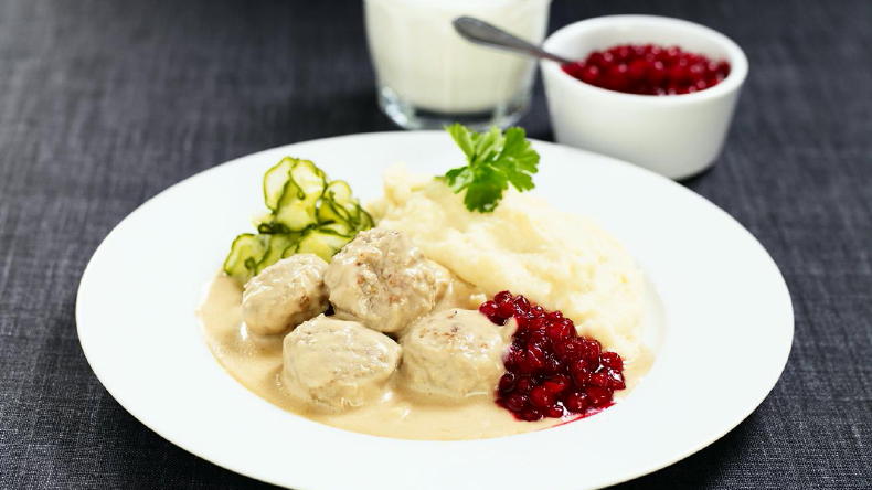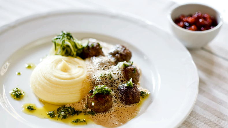 Köttbullar von Gooh mit Kartoffelbrei, „gräddsås“ und Preiselbeeren – noch schwedischer geht es nicht (Bild: Joel Wåreus/Gooh/Lantmännen)