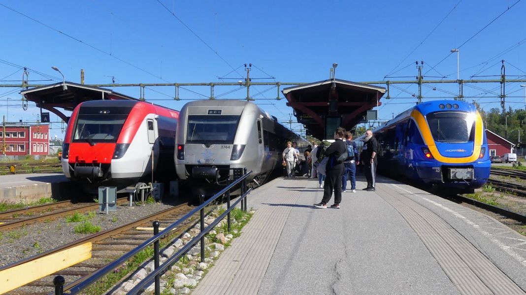 Sundsvall C: Links X-Tåget, in der Mitte SJ und rechts Norrtåg.