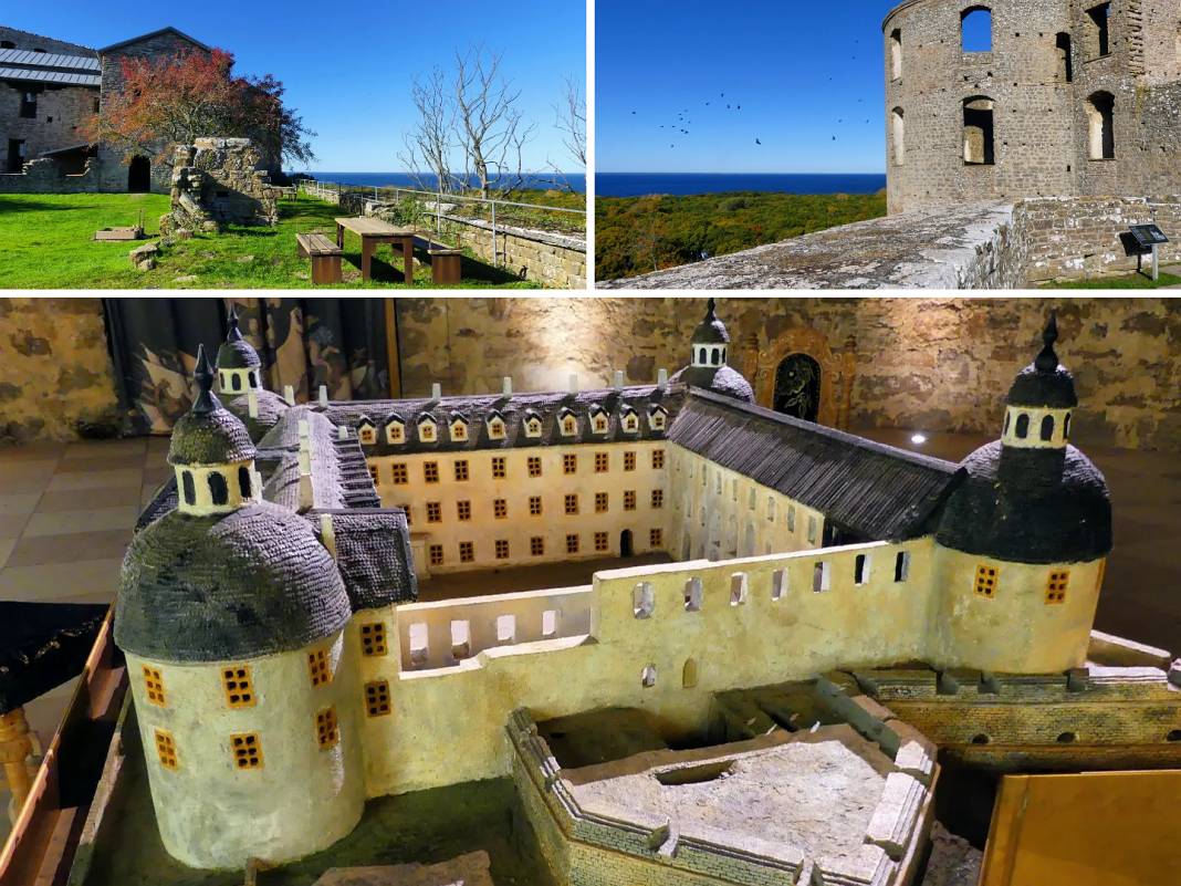 Schloss Borgholm. Das Modell im unteren Bild zeigt, wie das Schloss vor dem Brand ausgesehen haben könnte.