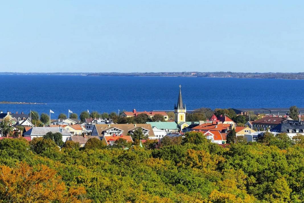 Blick vom Schloss Borgholm hinüber auf das Ortszentrum. In der Bildmitte seht ihr die Kirchturmspitze.
