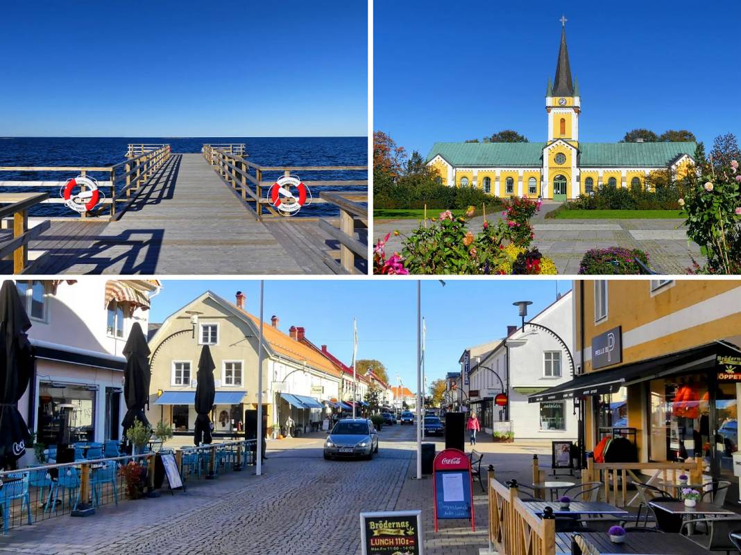 Oben links: Neuer Badesteg nördlich vom Ortszentrum. – Oben rechts: Kirche von Borgholm. – Unten: Storgatan, die Haupteinkaufsstraße. Von Mitte Juni an ist hier sehr viel los.