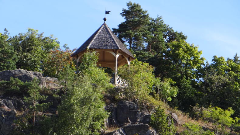 Wenn man am Kanalufer steht und den Blick nach oben richtet, sieht man einen Aussichtspavillon. Das Lusthaus steht auf Söderköpings Hausberg Ramunderberget. Dort oben ist die Aussicht beeindruckend.