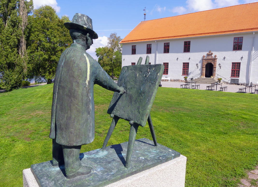 Wenn Ihr an Kunst interessiert seid, seht Euch eine kleine Skulptur vor dem Schloss an. Sie zeigt den impressionistischen Maler Prinz Eugen. Ungefähr an dieser Stelle hat er nämlich 1893 das Schloss gemalt. Ihr seht sein Bild weiter unten auf dieser Seite. Heute gehört es dem Museum Prins Eugens Waldemarsudde in Stockholm.