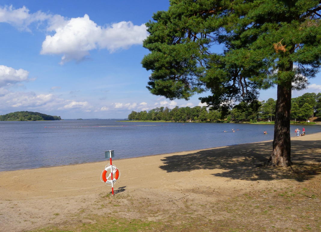 Parkplätze liegen auf beiden Seiten des weitläufigen, parkähnlichen Naherholungsgebiets. Alles wirkt sehr gepflegt. Sogar der große Sandstrand war bei meiner Ankunft morgens frisch geharkt.