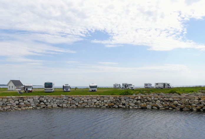 Blekinge: Listerlandet ist eine Halbinsel südlich von Sölvesborg. Dort gibt es im Hafen des Fischerdorfs Nogersund schöne Stellplätze mit Meerblick. Dieser Platz ist schon im Mai manchmal gut belegt. Es gibt 30 Stellplätze mit Strom und 20 weitere ohne Strom. Ein Hafenrestaurant bietet leckeren Mittagstisch („lunch“). Vom Hafen fährt auch die Personenfähre zur Insel Hanö ab. Das Foto habe ich von der Fähre aus gemacht.