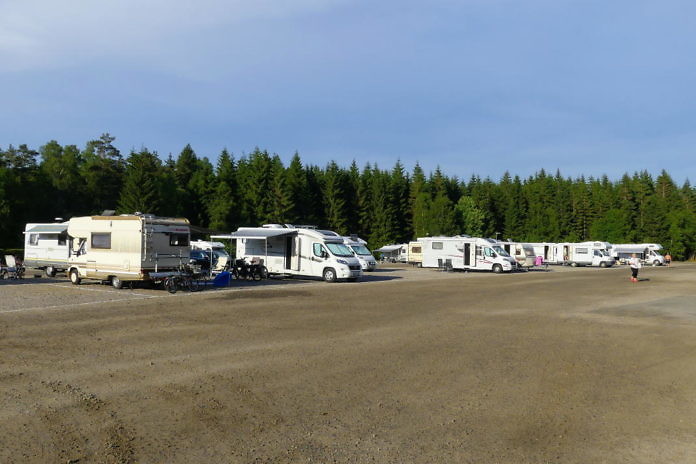 Småland: Nein, das Bild soll Euch nicht abschrecken. Das ist kein Stellplatz im üblichen Sinn. Hier in Jönköping findet immer Anfang September Schwedens Campingmesse statt. Das ist für viele Camper ein feierlicher Saisonausklang.
