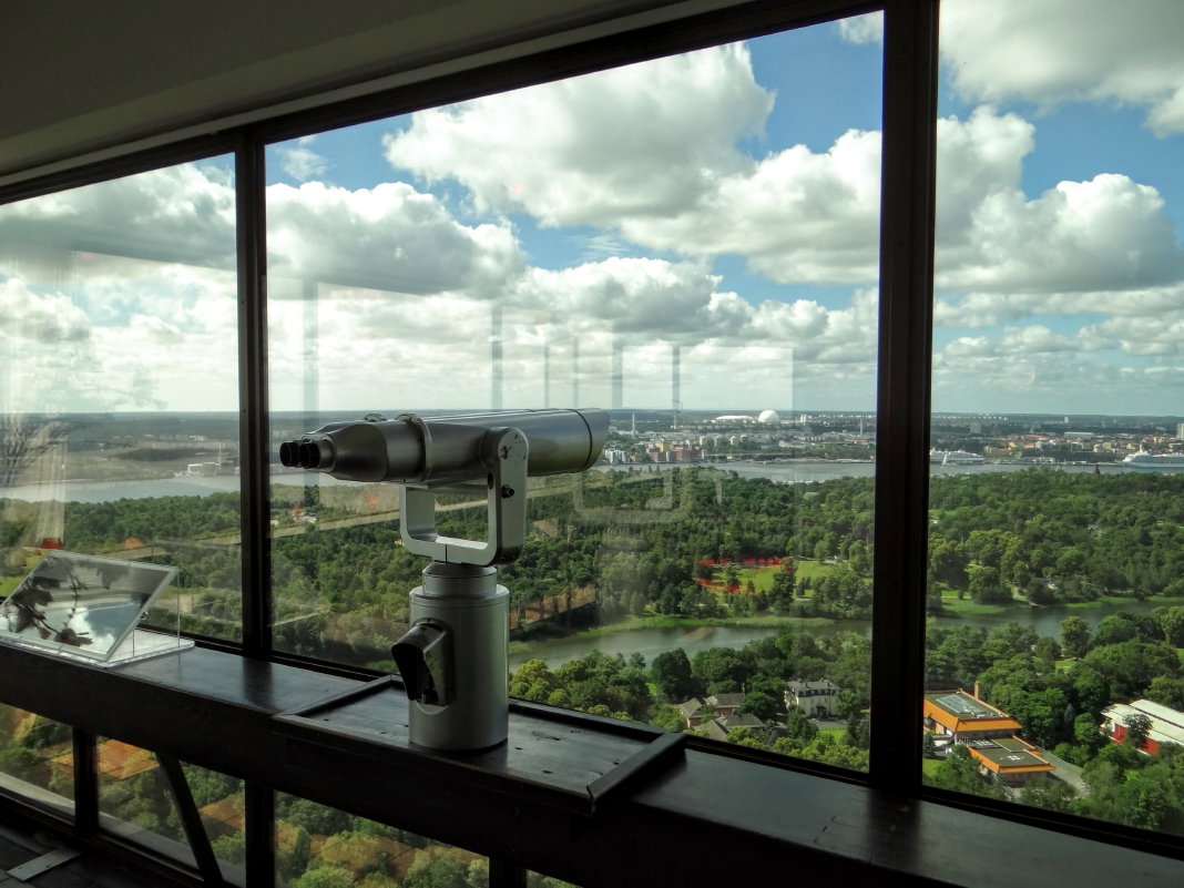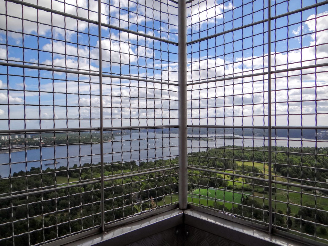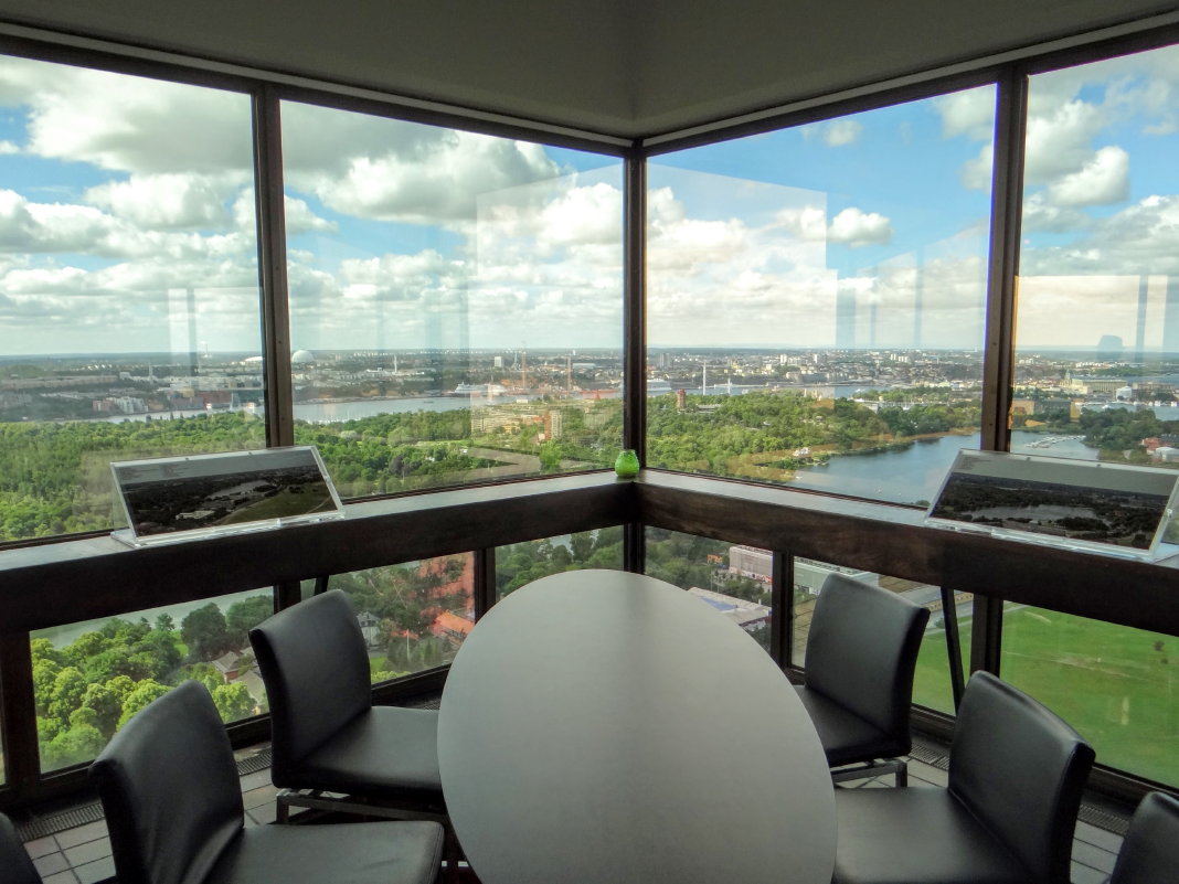 Im 31. Stock gibt es eine Aussichtsplattform, von der man einen fantastischen Blick über Djurgården und große Teile von Stockholm hat. Die Plattform befindet sich draußen und auf einer Höhe von 155 m. Sie ist mit einem Metallzaun (eigentlich ist das schon ein Käfig) versehen. Die Maschen sind recht eng, so daß ein Kameraobjektiv nicht hindurchpasst. Da lässt es sich mit der Handykamera sogar leichter fotografieren. Es gibt aber einige Fotoklappen, durch die man unbehindert fotografieren kann. Den Schlüssel zu diesen Klappen erhält man einen Stock tiefer in der Skybar.